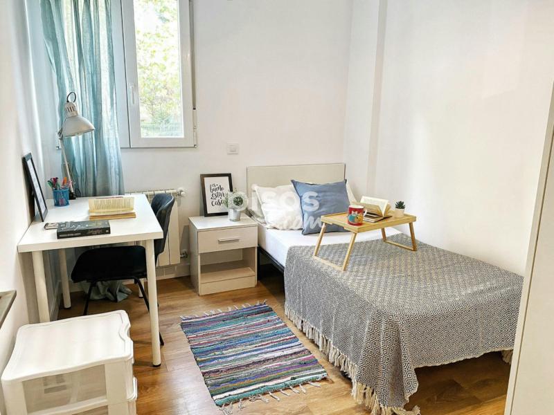 This room, perfect for students, is for rent in Madrid. This affordable, bright and comfortable room with an exterior view is very cozy. It has a comfortable bed, spacious desk and chair, as well as a built in spacious closet and bookshelf.