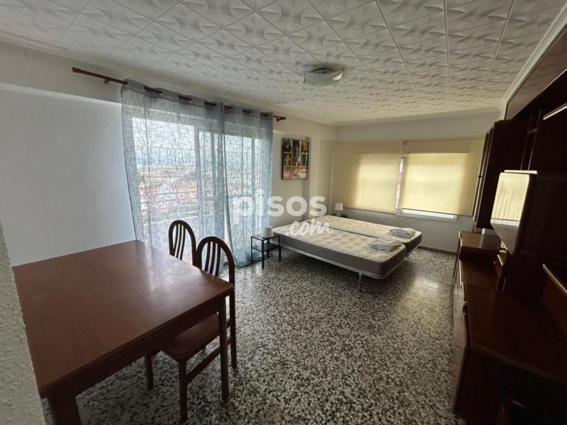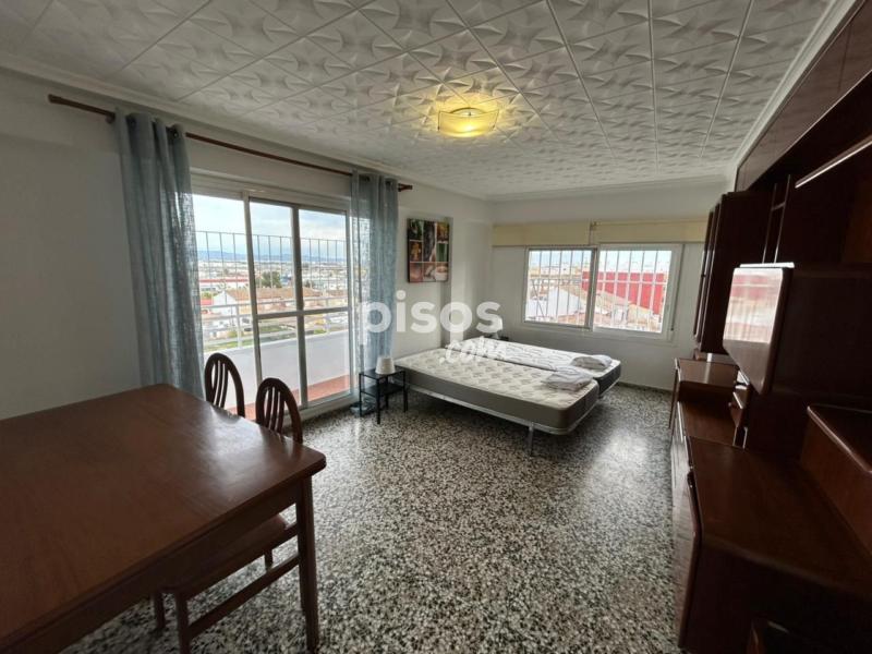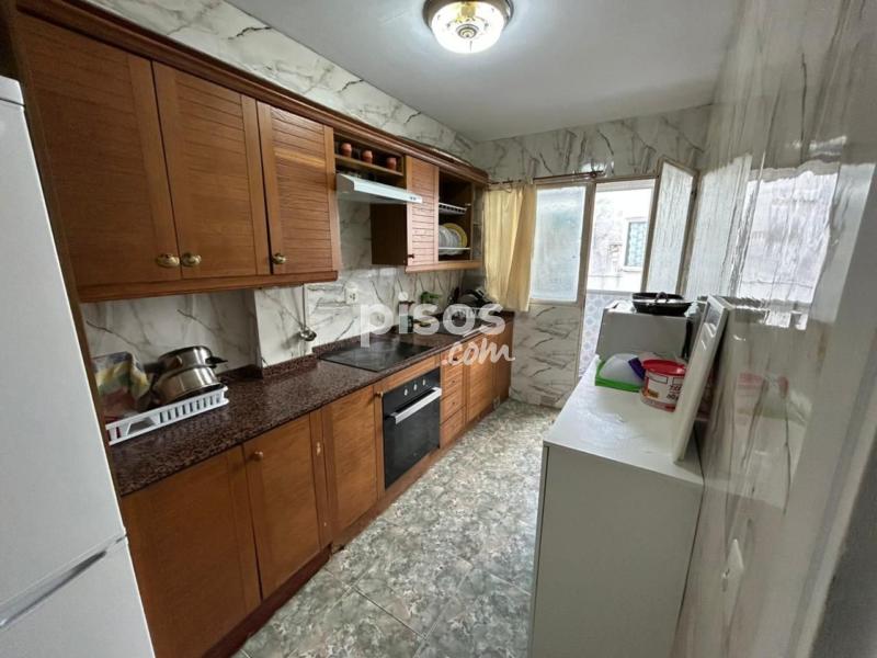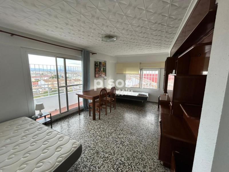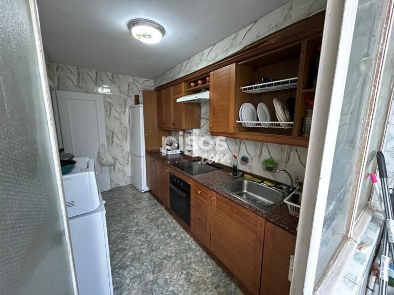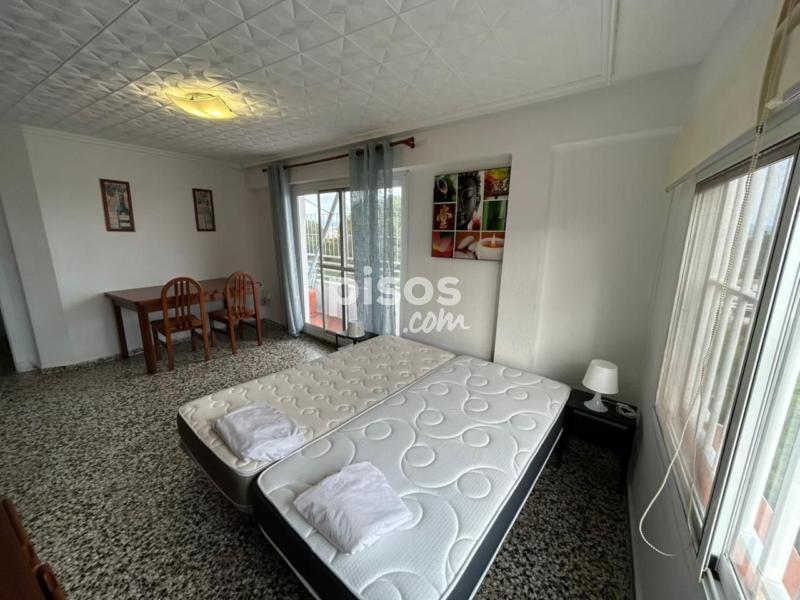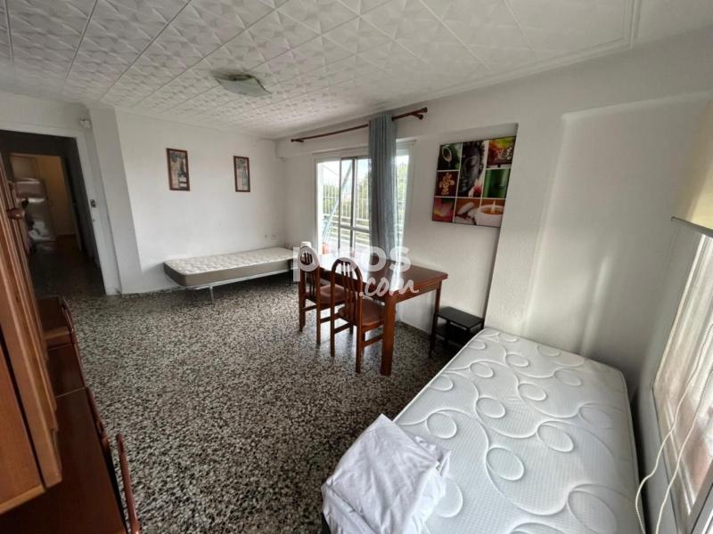 La habitación está amueblada con cama, colchón, mesitas de noche, escritorio y sillas, pero no se incluyen sábanas ni almohadas. La cocina está equipada con nevera, horno, encimera, campana, lavadora, microondas y se incluye menaje de hogar.