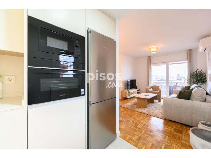 Alquiler temporal. Amplio y elegante piso de dos dormitorios con terraza, situado en la Calle Moscatelar, en el barrio de Hortaleza, Madrid. Ubicado en una zona residencial tranquila y segura, es ideal para estancias por motivos de trabajo, estudios o para visitar y disfrutar de Madrid. La vivienda es exterior, muy luminosa, moderna y esta reformada, con una terraza que ofrece agradables y hermosas vistas a la ciudad. El edificio cuenta con ascensor y se encuentra muy bien comunicado.