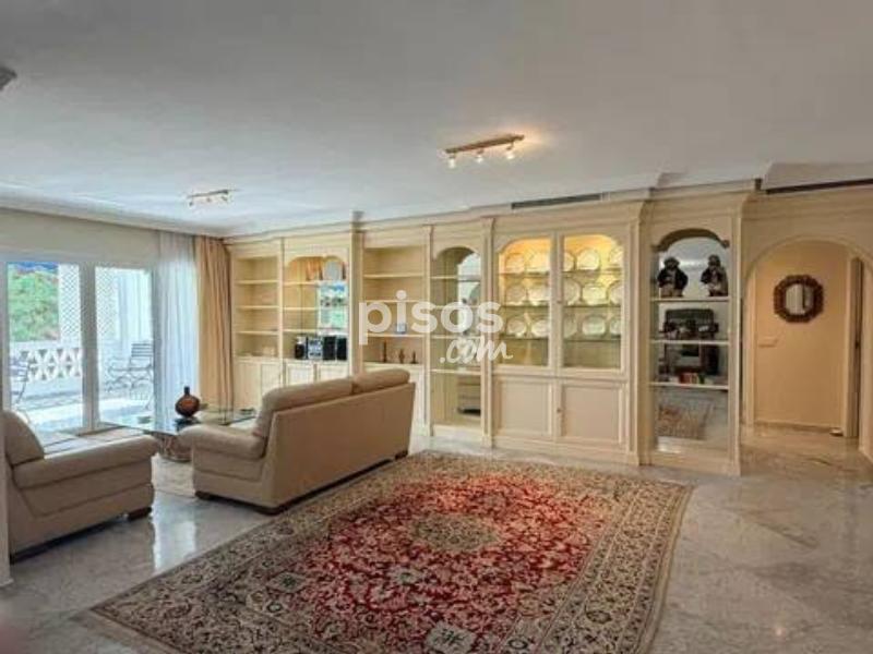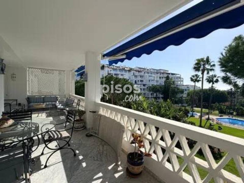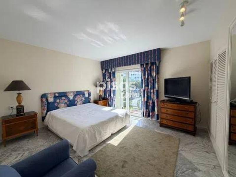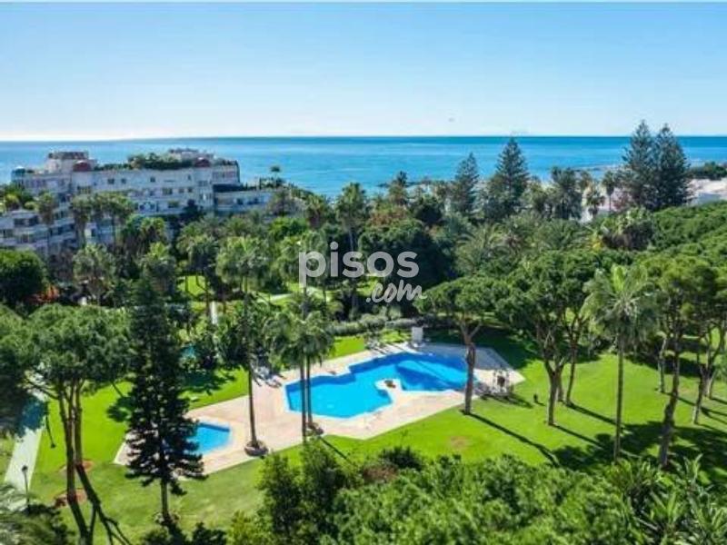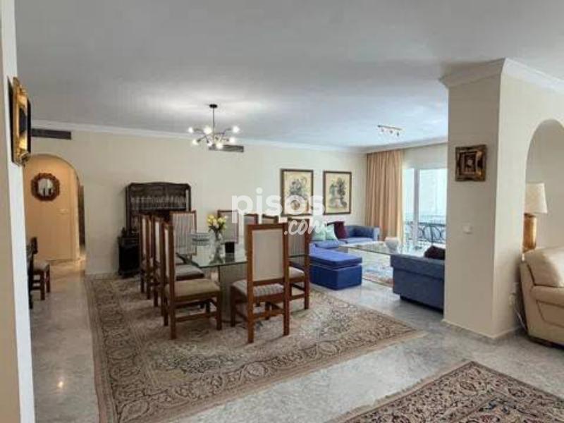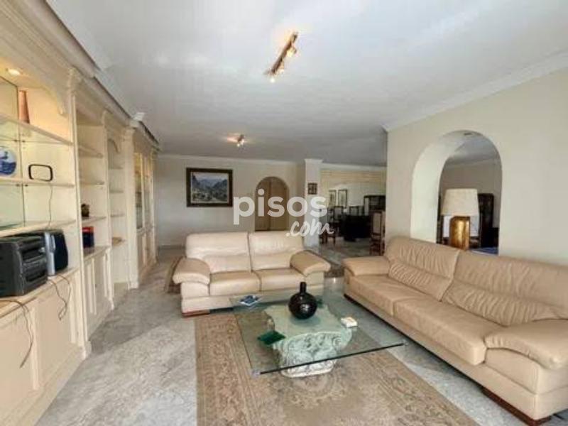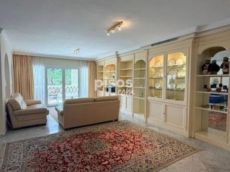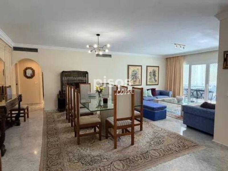 Vivir en primera línea en Puerto Banús es un privilegio reservado a muy pocos, y este espectacular apartamento en Playas del Duque, Edificio Sevilla, lo confirma desde el primer instante. Ubicado en una de las urbanizaciones más exclusivas de la zona, con acceso directo tanto a la playa como al propio Puerto Banús, ofrece una combinación perfecta de ubicación, amplitud y estilo de vida. La vivienda cuenta con aproximadamente 375 m² interiores más 30 m² de terraza cubierta con magníficas vistas, ofreciendo espacios generosos y llenos de luz natural. Desde su espacioso hall se accede a un amplio salón y a una biblioteca, además de un elegante salón comedor independiente; ambos con grandes ventanales, una luminosidad excepcional y salida directa a una agradable terraza ideal para disfrutar del clima de Marbella durante todo el año. Dispone de cinco dormitorios dobles de gran tamaño y cinco baños completos, tres de ellos en suite, todos con armarios empotrados que aportan funcionalidad y orden. La cocina está totalmente equipada e incluye office, además de una práctica zona independiente de lavado y planchado, pensada para el máximo confort en el día a día. Como valor añadido diferencial, el inmueble incluye dos amplias plazas de garaje con capacidad para vehículos de hasta 6 metros, un auténtico lujo en esta ubicación. La urbanización es simplemente excepcional: premiada con el Premio Andalucía de Jardinería, ofrece impresionantes zonas comunes, tres piscinas, dos restaurantes propios y servicio de seguridad 24 horas, garantizando privacidad y tranquilidad. Todo ello con acceso directo a la playa y a Puerto Banús, permitiendo disfrutar caminando de boutiques, restaurantes y el puerto deportivo más emblemático de la Costa del Sol. Un apartamento único por su amplitud, su ubicación privilegiada en Puerto Banús y sus comodidades exclusivas, ideal para quienes buscan vivir el lujo frente al mar sin renunciar a espacio y privacidad.