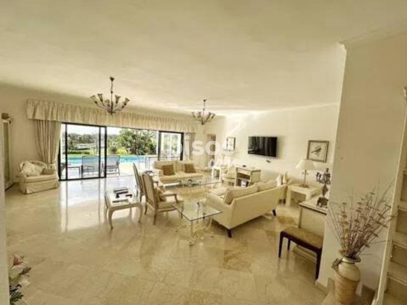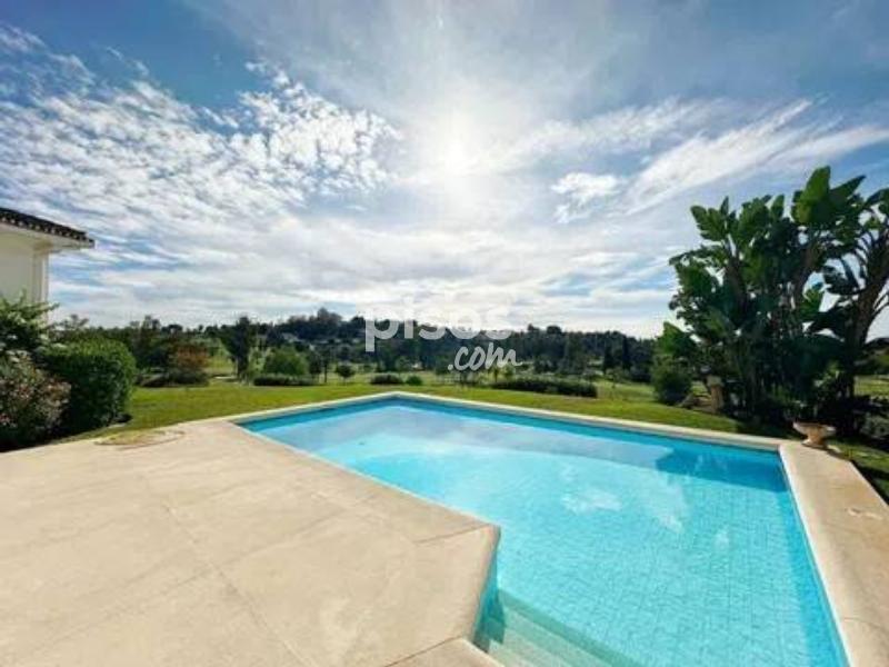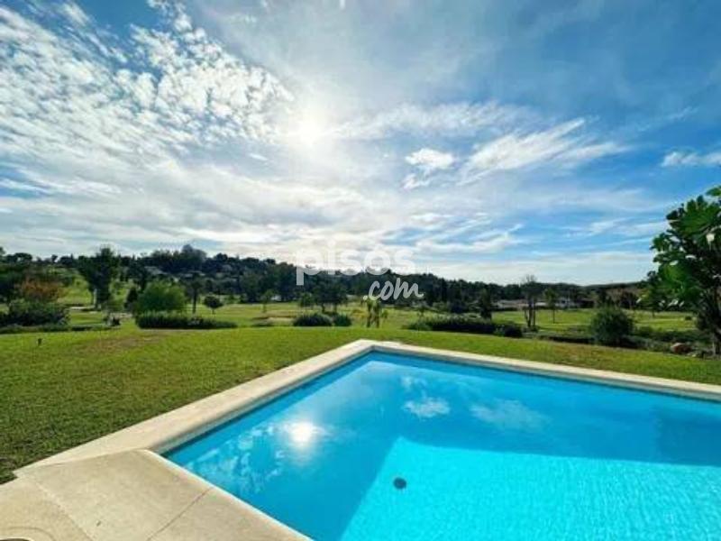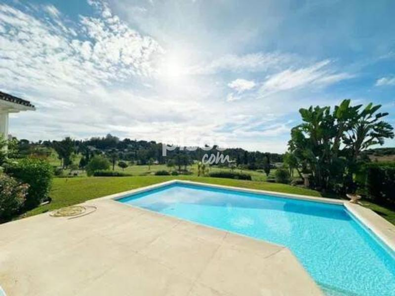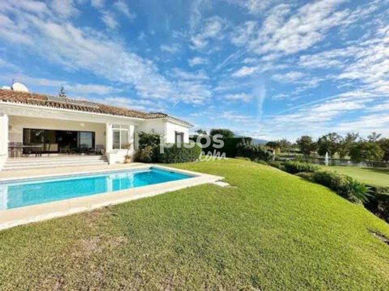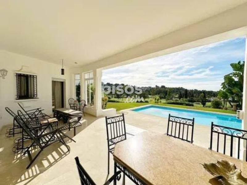 ? Villa de Lujo en Primera Línea de Golf en El Paraíso, Benahavís: Diseño de una Planta y Vistas al Lago Impresionante villa de una sola planta situada en primera línea de golf en El Paraíso, Benahavís, con una orientación suroeste que garantiza sol durante todo el día. Una propiedad excepcional que destaca por su diseño contemporáneo y sus vistas panorámicas al campo de golf, al lago y a la exuberante vegetación circundante. Ubicada en una generosa parcela de 1.670 m², la vivienda cuenta con 450 m² construidos distribuidos íntegramente en un solo nivel para máxima comodidad. Consta de 4 amplios dormitorios y 3 baños, con una distribución de concepto abierto y grandes ventanales que maximizan la entrada de luz natural. La espaciosa sala de estar se integra perfectamente con una terraza cubierta, ideal para disfrutar de cenas al aire libre. La cocina está totalmente equipada con acabados de primera calidad, y la propiedad incluye extras funcionales como un garaje para dos vehículos y amplio espacio de almacenamiento. El exterior de la villa es un auténtico oasis de paz, compuesto por un jardín privado maduro y una piscina orientada a disfrutar de atardeceres inolvidables sobre el campo de golf. La ubicación en El Paraíso es privilegiada, ofreciendo un ambiente exclusivo y tranquilo, a la vez que se encuentra a solo unos minutos de San Pedro, Puerto Banús y Marbella, rodeado de los mejores servicios, restaurantes y playas doradas de la región. No pierda la oportunidad de adquirir esta villa de elegancia atemporal en una ubicación inmejorable. Contáctenos hoy mismo para organizar su visita privada.