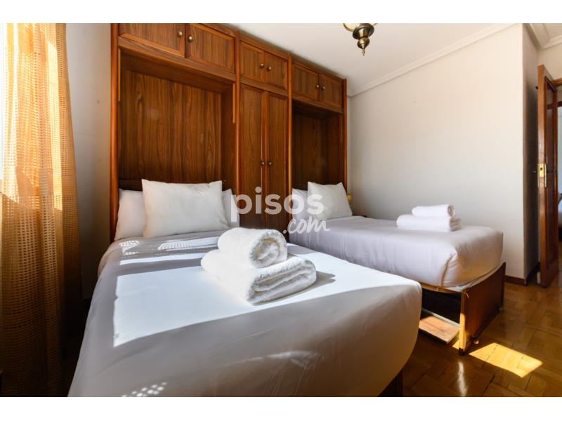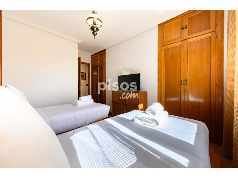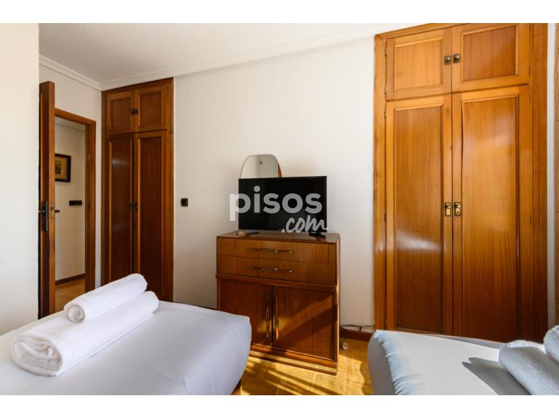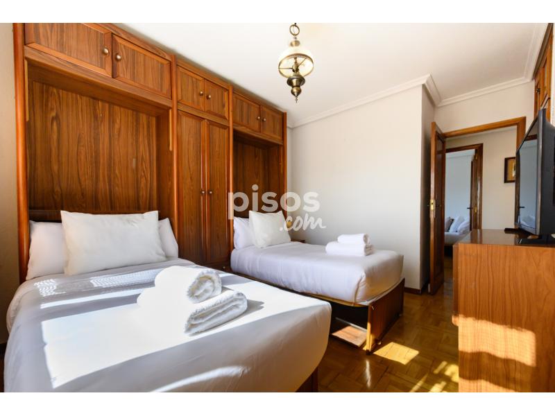• Dormitorio con dos camas individuales, armarios empotrados, cómoda, TV y amplia ventana con vistas al exterior.