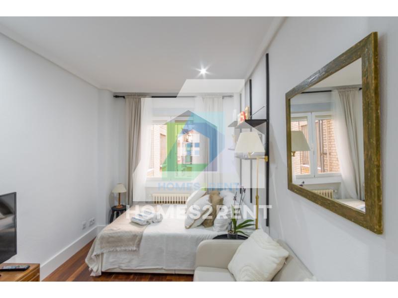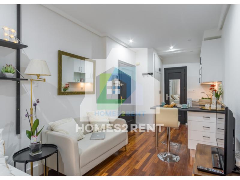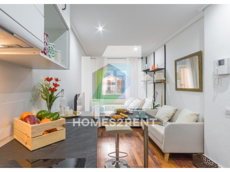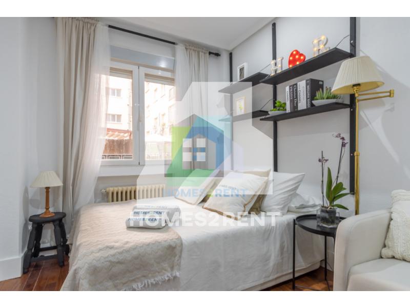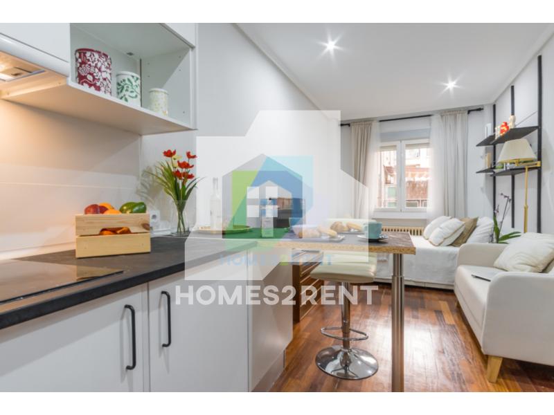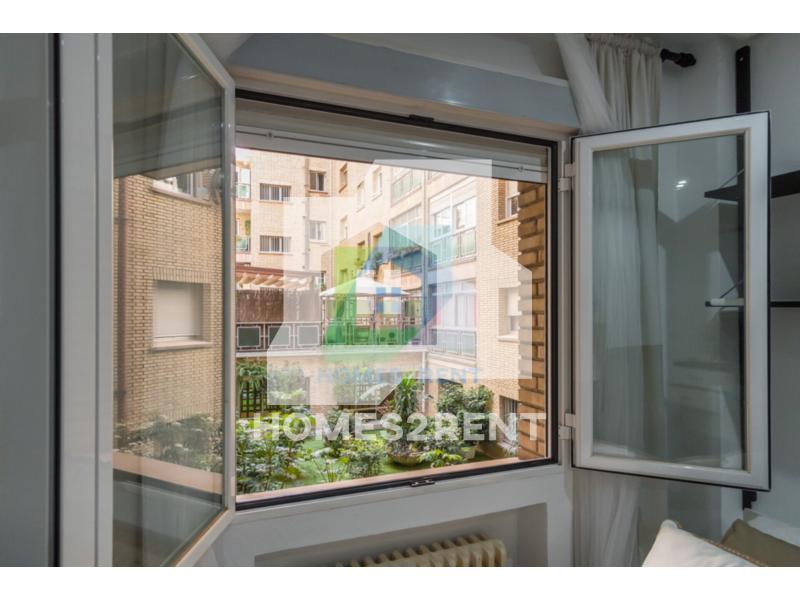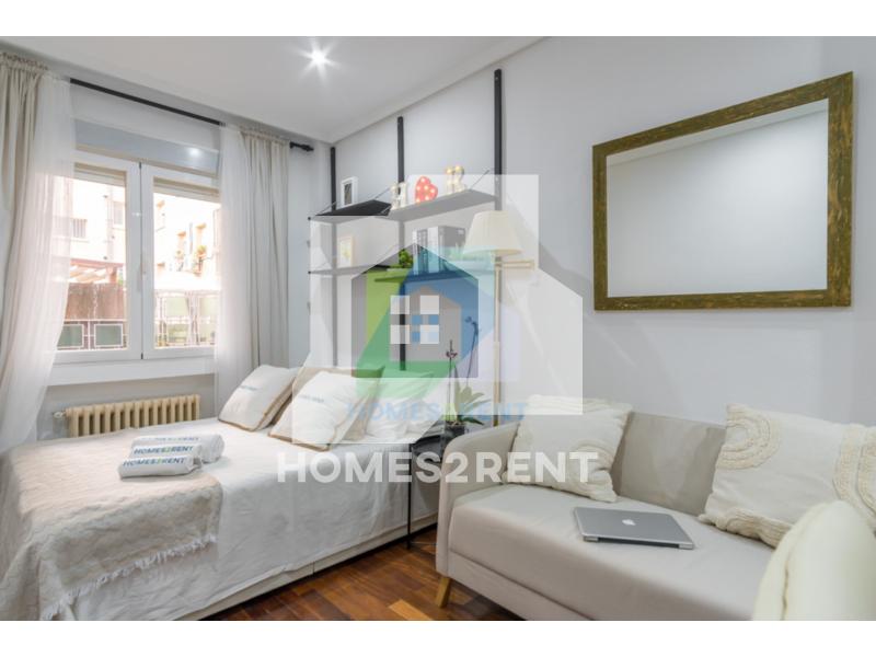 Homes2rent. se complace en presentar este luminoso y bonito estudio recien reformado y a estrenar, situado en la primera planta, de un edificio de 1974 en La zona Guindalera del barrio de Salamanca. La vivienda goza de unas vistas muy agradables junto al jardin del edificio.