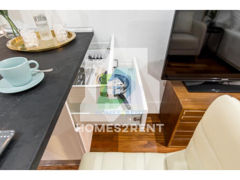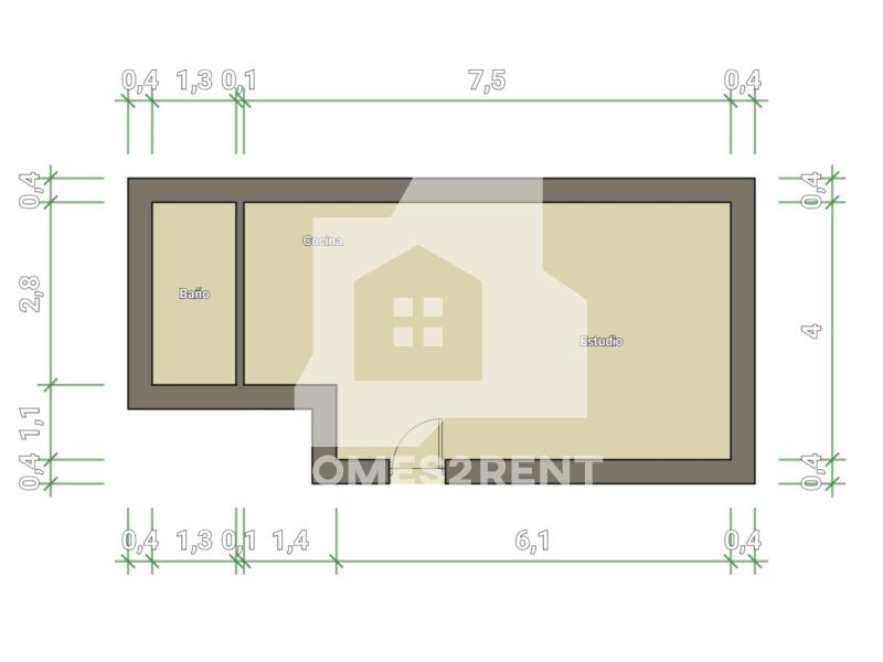 Muy cercano al parque de Eva Duarte, la vivienda dispone de una gran cantidad de luz natural gracias a su ventanal junto al jardin, presenta ademas un excelente aprovechamiento de espacio. En la entrada se encuentra situada la cocina integrada con todos sus electromesticos y gran capacidad de armarios, a nuestra derecha se encuentra un pequeño espacio donde esta situado el sofa y la televisión y justo al lado la cama de 1,35 x 1.90