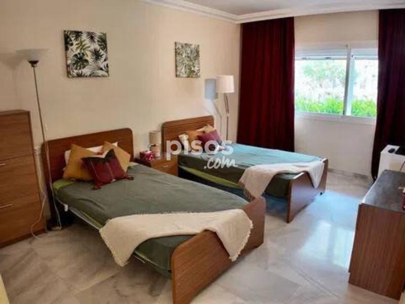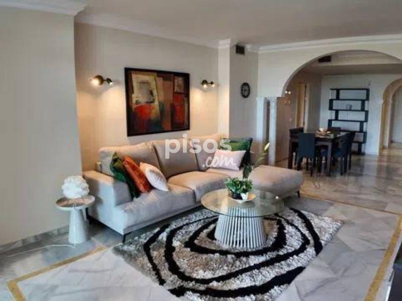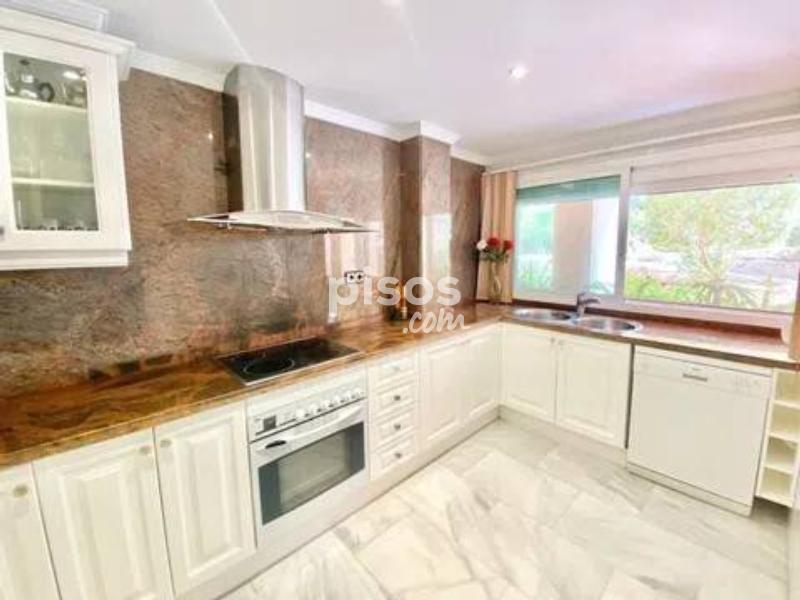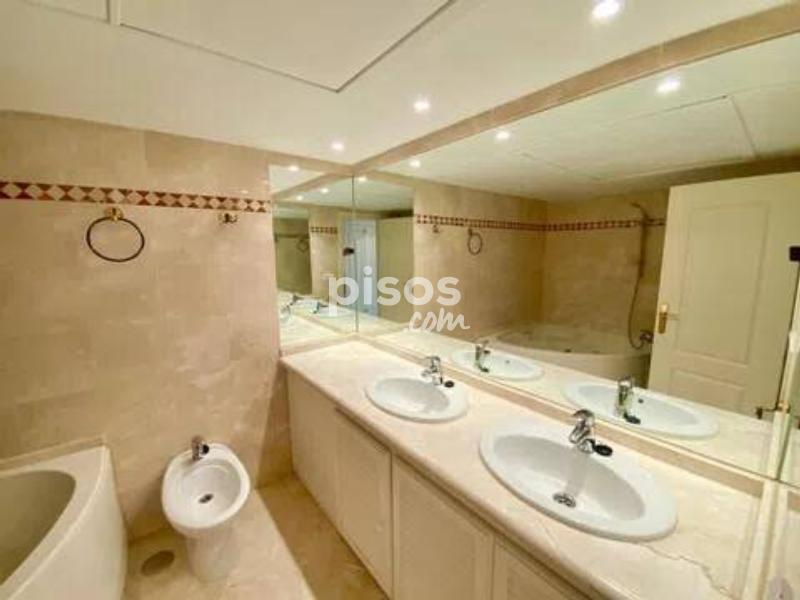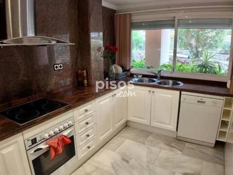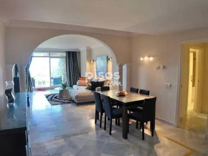 En la prestigiosa urbanización Magna Marbella, situada en el corazón de Nueva Andalucía, se encuentra este excepcional apartamento en alquiler que ofrece una combinación perfecta de lujo y comodidad. Este exclusivo bajo cuenta con dos amplios dormitorios, cada uno con su propio baño en suite, proporcionando el máximo confort y privacidad. Además, dispone de un aseo de invitados, ideal para visitas. La cocina independiente está completamente equipada con electrodomésticos de alta calidad, proporcionando un espacio funcional y moderno para preparar deliciosas comidas. El salón-comedor, amplio y luminoso, es el lugar perfecto para relajarse y disfrutar de momentos de calidad con familiares y amigos. Desde aquí, se accede a una terraza cubierta que se extiende hacia un amplio jardín privado, ofreciendo un espacio exterior excepcional para disfrutar del clima mediterráneo. El jardín es un verdadero oasis de tranquilidad con impresionantes vistas al mar y a Gibraltar, creando un ambiente idílico para disfrutar de las tardes soleadas o de las noches estrelladas. Este espacio exterior es ideal para cenas al aire libre, momentos de relajación o simplemente para disfrutar de las vistas panorámicas. La urbanización Magna Marbella es reconocida por sus lujosas instalaciones, que incluyen varias piscinas y hermosos jardines paisajísticos que brindan un entorno sereno y relajante. La ubicación privilegiada de esta urbanización en Nueva Andalucía la coloca cerca de una amplia variedad de comercios, restaurantes y el famoso Puerto Banús, conocido por su vibrante vida nocturna, tiendas exclusivas y hermosas playas. Además, el apartamento incluye una plaza de parking, añadiendo comodidad y seguridad para los residentes. La urbanización cuenta con seguridad las 24 horas, garantizando un entorno seguro y tranquilo. Este apartamento en Magna Marbella es una opción ideal tanto para aquellos que buscan una residencia permanente como para quienes desean una elegante casa de vacaciones en una de las zonas más codiciadas de Marbella. La combinación de sus características de alta gama, su ubicación envidiable y las impresionantes vistas lo convierten en una propiedad única que ofrece un estilo de vida incomparable. No pierda la oportunidad de vivir en este exclusivo enclave de lujo y confort. ¡Contáctenos hoy mismo para más detalles y para programar una visita!