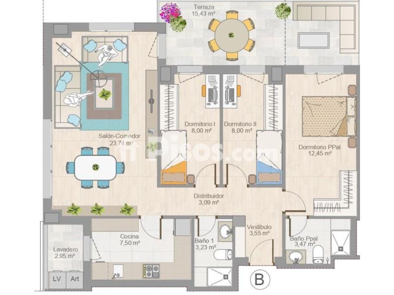3 dormitorios exteriores, 2 cuartos de baño completos