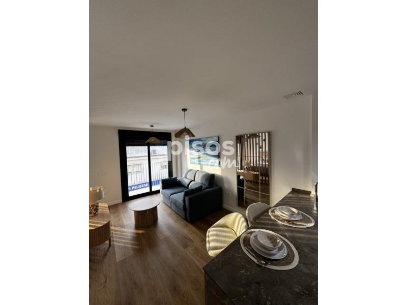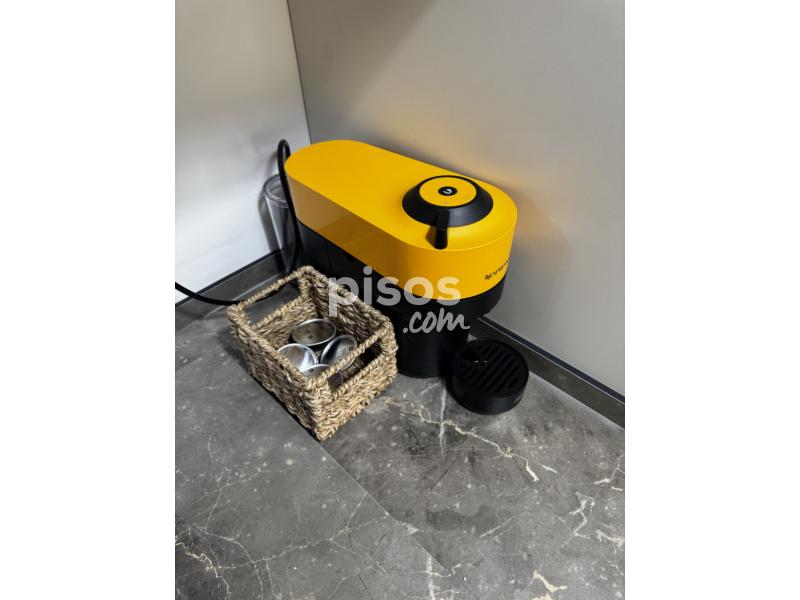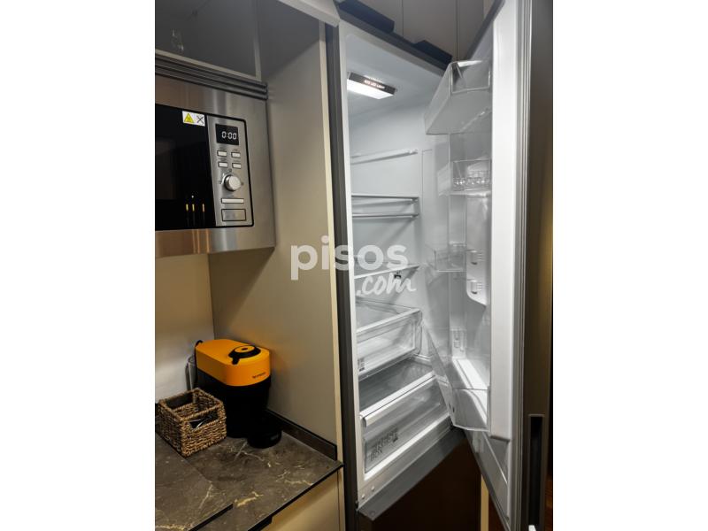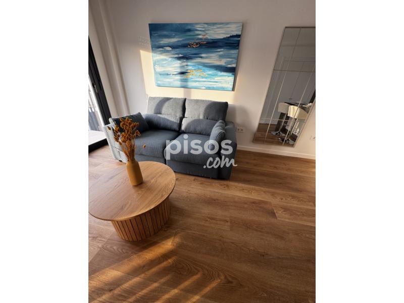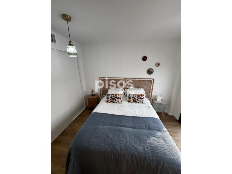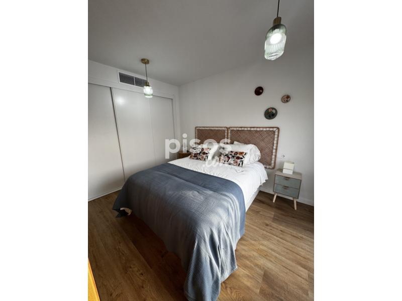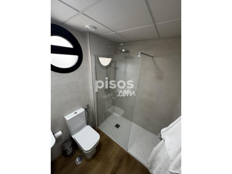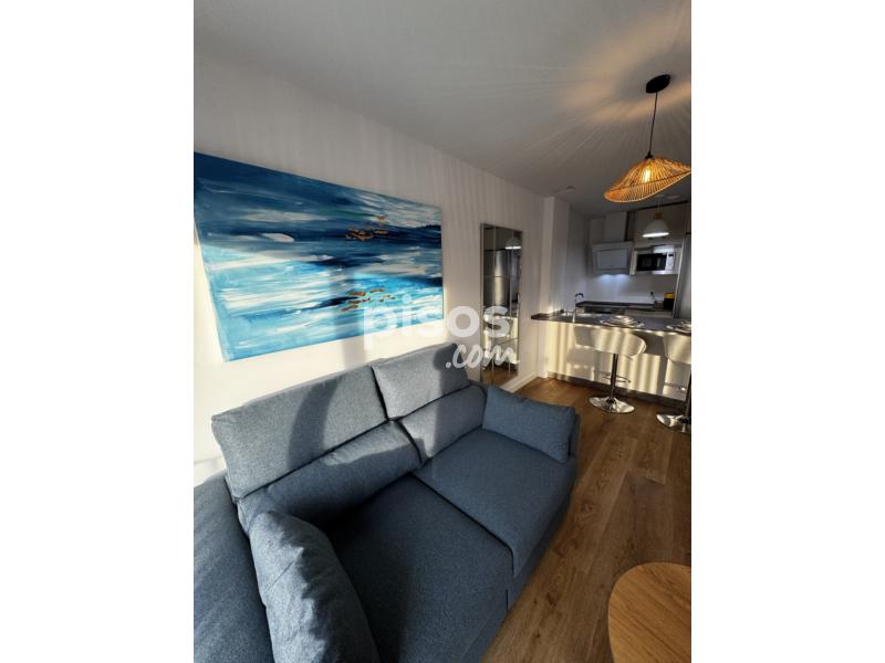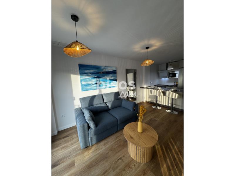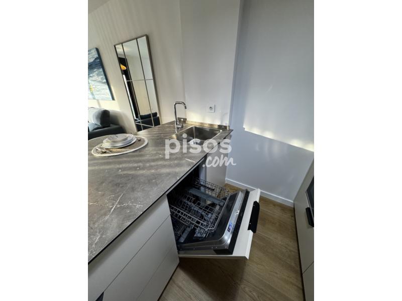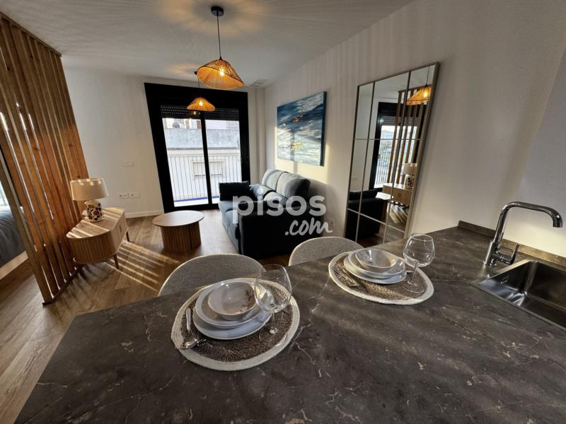Dispone de doble terraza, cocina totalmente equipada (horno, microondas, frigorífico, lavavajillas y lavadora), dormitorio con cama de 1,50 m y armario empotrado, salón amueblado y baño con plato de ducha. Distribución tipo loft con celosía decorativa y ventanales amplios.