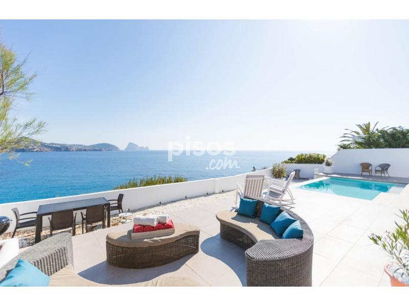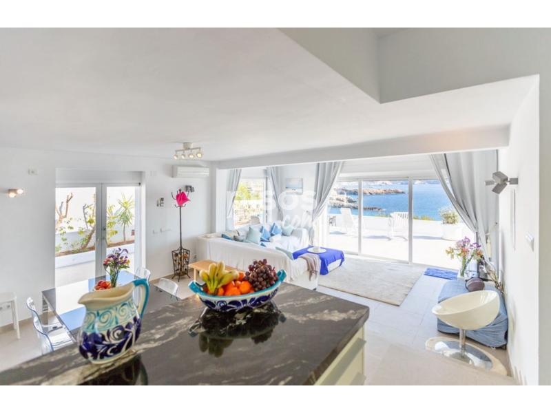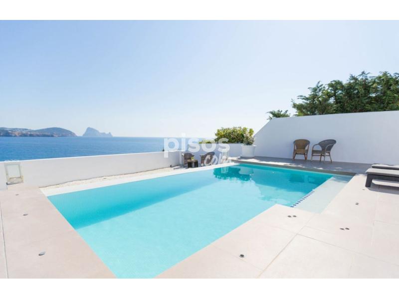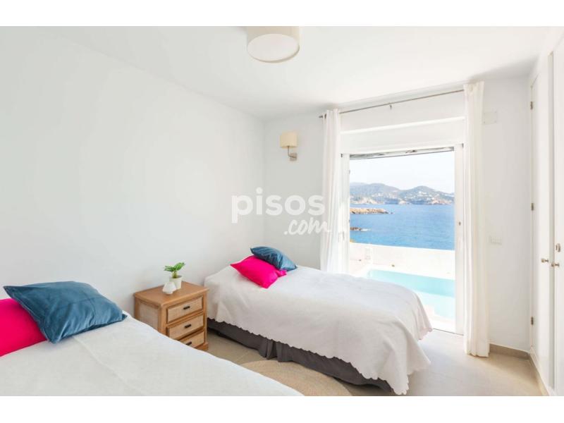 Casa de ambiente familiar con espectaculares vistas al mar, a sólo 5 minutos caminando de la playa de Cala Codolar y 1,2km de Cala Conta y en primera línea de mar. Es una casa espaciosa, con mucha luz y decorada con gusto y calidad. Dispone de 3 habitaciones, una con cama de matrimonio, una con dos camas individuales y la tercera con litera. Hay tres baños con ducha, uno para cada habitación. La cocina es abierta, recibe mucha luz y se puede ver el mar también desde aquí. Está equipada con una gran nevera con congelador, placas de inducción, horno eléctrico, una completa vajilla y un gran número de ollas y sartenes. Junto a la cocina está el salón y comedor, en una misma estancia. El comedor tiene una mesa para 6 personas, y el salón un gran sofá en ele y TV. Toda esta estancia comunica con la terraza de la piscina a través de grandes cristaleras. La terraza exterior es muy amplia y rodea toda la casa. En la parte frontal, con las vistas al mar está la piscina, sofás y sillones de exterior. Hay una parte cubierta de piedra blanca y el resto es terraza embaldosada. En uno de los laterales está la barbacoa y zona de lavadero, y en el lado opuesto hay una mesa de exterior con espacio para 10 comensales. Hay un total de tres toldos automáticos que se pueden abrir sobre la terraza frontal, lateral y trasera, para aportar sombra a estas partes. La entrada de la casa tiene un gran portón, aunque los coches se aparcan delante de la casa, en la calle. Todas las estancias disponen de aparatos de aire acondicionado. Además del aire acondicionado, en el salón hay un gran ventilador de techo. Hay una escalera que conduce a la azotea de la casa, un espacio que aunque no está amueblado puede ser ideal para sentarse a disfrutar de una inmejorable panorámica o hacer yoga por la mañana. Por seguridad de los más pequeños, el acceso a la azotea tiene una puerta que se debe dejar cerrada. La piscina también se puede vallar completamente en caso de niños. Desde la casa, a apenas 5 minutos caminando, se llega a una pequeña cala de piedra conocida como Playa Codolar. Cala Conta, una de las más bellas playas de agua cristalina y bonitas puestas de sol está a apenas 3 minutos en coche.