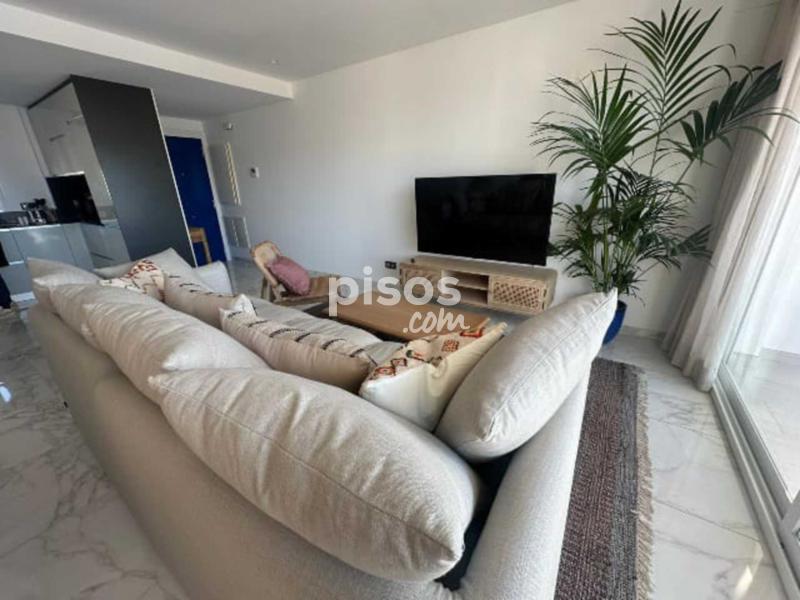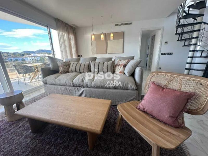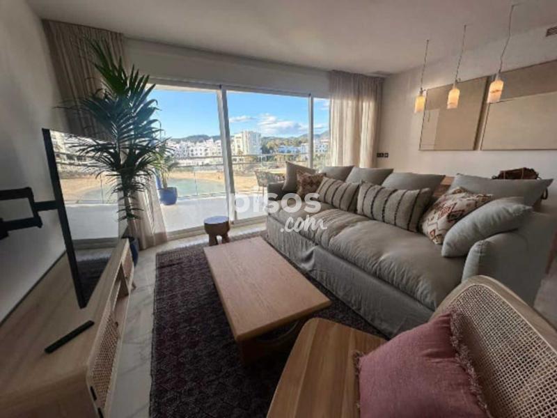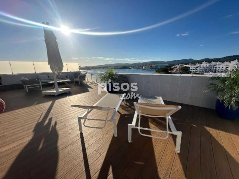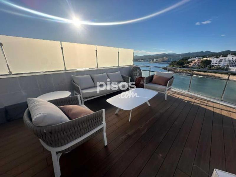 Desde el salón hay un acceso a un solarium de 60m2, todo equipado para disfrutar del exterior con vistas al mar, dispone de un comedor para 6 personas, de una zona de descanso con sofa, sillones y mesita, tumbonas para tomar el sol, ducha exterior, decorado con plantas y tarima de teka.