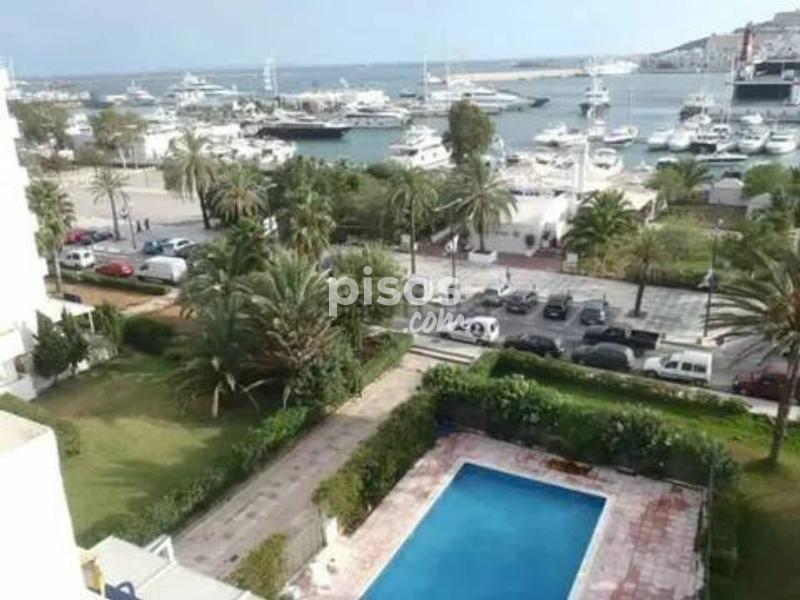 TEMPORADA DE VERANO! Se alquila desde 1 de Mayo hasta 4 de Octubre en Marina Botafoch, cerca de Gran Hotel, piso de 2 habitaciones matrimonial, salon luminoso, cocina toda equipada, 2 banos (uno en suite con bañera) terraza vista mar y piscina comunitaria. Se pide pago por adelantados. Fianza + comisión de la agencia Los gastos de luz y internet se pagan a parte el agua estas incluida.