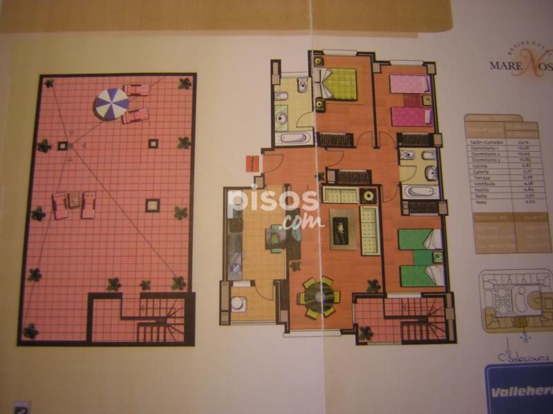 Urbanización completa, 3 dormitorios, 2 baños, cocina, galería, comedor, cuatro armarios empotrados forrados, dos terrazas, una en planta y otra en la planta superior. Superficie útil 94 m y superficie terraza 77 m. Primeras calidades, parquet, puertas de roble, encimera de granito, vitrocerámica, horno, gas ciudad, preinstalación de aire. Incluido en el precio plaza de garaje y trastero.