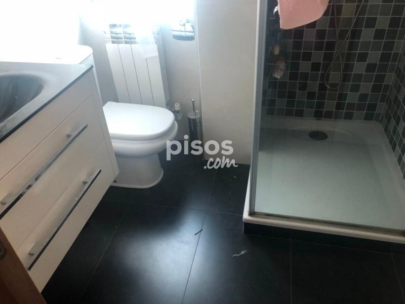 El baño recién reformado con plato de ducha y mueble de lavabo moderno en negro.