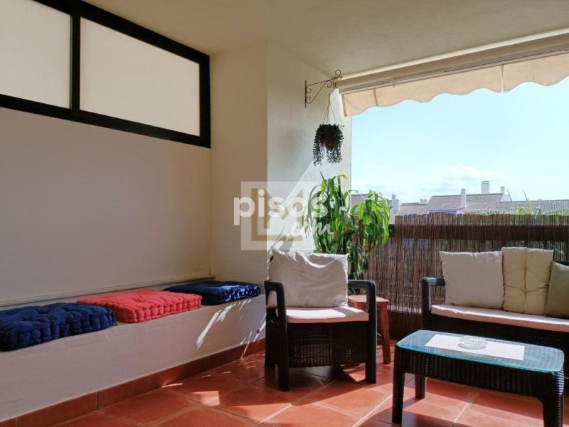 La urbanización ofrece piscina con hamacas, jardines bien cuidados y un entorno tranquilo y seguro para familias.