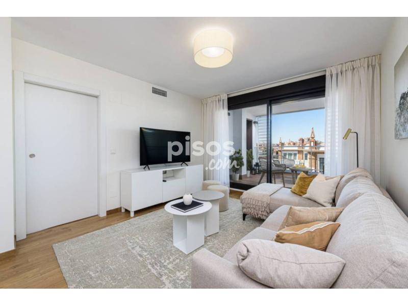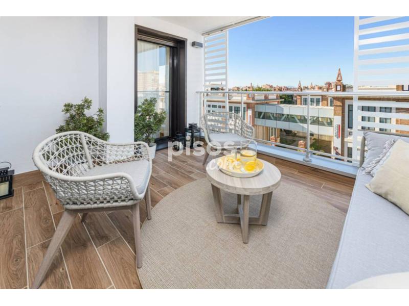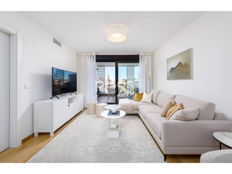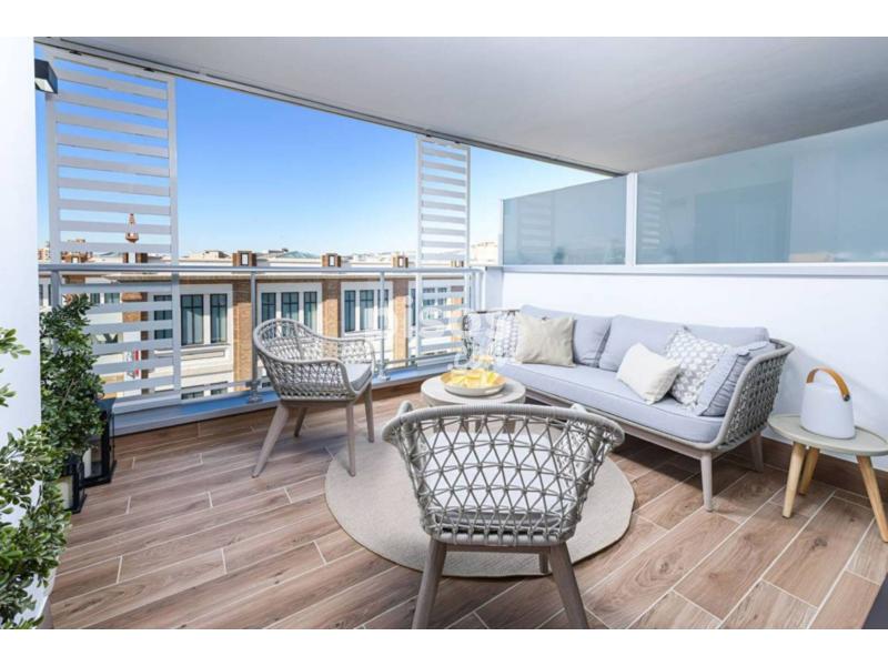 El luminoso comedor/salón tiene acceso directo a una cómoda terraza con inmejorables vistas a uno de los edificios más emblemáticos de Málaga, la Tabacalera, que ahora alberga uno de los museos más prestigiosos de Málaga.