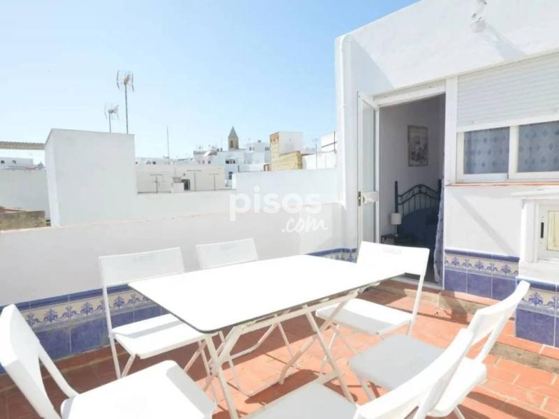 Disponible solo del 9 al 31 de mayo. Si te interesa manda mensaje escrito por email o whatsapp en el 744717008 porque lo atiendo mejor. Este apartamento se distribuye en 2 plantas. Dispone de un salón-comedor con cocina americana, 2 baños con ducha y 3 dormitorios 1 con 2 camas y 2 con cama de matrimonio. Desde uno de los dormitorios se puede acceder directamente a una pequeña azotea privada, desde donde disfrutará de una vista maravillosa al mar. Este bonito apartamento se encuentra en el casco antiguo de Conil, en uno de los callejones típicos, cerca de la puerta de la ciudad. La playa está a unos 10 minutos andando Para ver mas casas www.casasdeconil.com