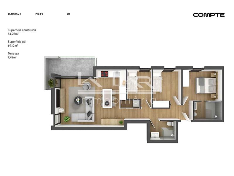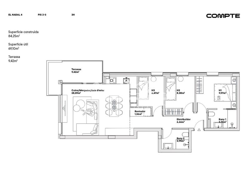 Luz, diseño y armonía en un entorno privilegiado, con una superficie construida de 84,25 m² y una superficie útil de 69,10 m².