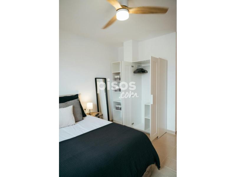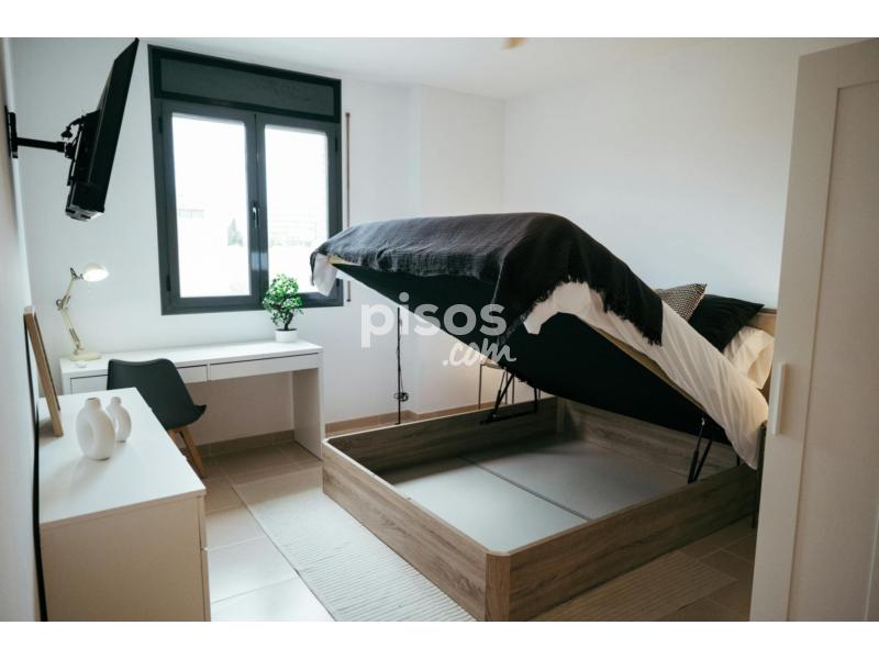 Fully furnished double room with a lift-up bed, Smart TV, desk, closet, ceiling fan, and bedding (pillows, comforter, sheets, towels).