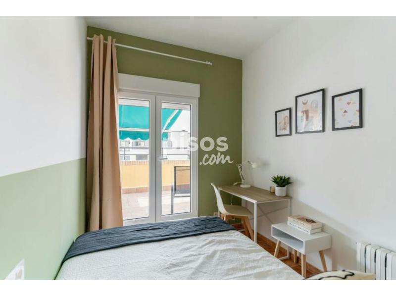 This building has 29 bedrooms, 13 bathrooms and one toilet on 4 floors. Tenants occupying floors 1 and 2 share the common areas located on floor 1, while those occupying floors 3 and 4 share the common areas on floor 3. The apartment has an elevator, stairs, storage room on floor 1, fully equipped kitchen area with appliances (ceramic hob, refrigerator, oven, microwave), kitchenware and dining area. Perfect for international students and young professionals, located only 13 minutes away from the university area and office area, known for its cosmopolitan atmosphere and its variety of services and activities, a unique opportunity to enjoy life in Madrid! This building is located in the Bellas Vistas neighborhood, however, it is on the border of three other important neighborhoods such as Cuatro Caminos, Rios Rosas and Vallehermoso. Here you can find everything you would expect from a great neighborhood near the capital. You probably won''''t find a better and safer neighborhood than Bellas Vistas in Madrid. It is located in the upper part of the city, has spectacular views and is very quiet. Here you can find everything you need to live like a real Madrileño: stores, bars, restaurants and much more. The Bellas Vistas neighborhood is located in the residential and economic area of Madrid. This means that you have plenty of stores, restaurants and bars nearby. The building enjoys excellent accessibility to public transport, being located in the vicinity of several metro stations and bus stops on Bravo Murillo street. Just a *4 minute* walk away is the *Cuatro Caminos* metro station with access to lines 1, 2 and 6 of the metro network and also *5 minutes* away is the *Alvarado* metro station that connects to line 1. In addition, a short distance away on Calle Bravo Murillo is the bus stop with multiple lines, such as *line 3* that connects to the center of Madrid. While in Paseo la Castellana is the *line 45* that connects directly to Plaza Cibeles. An additional advantage is the ease of use of the *Bicimad* system, which provides a healthy and sustainable option for getting around Madrid by bicycle. With an affordable monthly subscription, approximately 10€, it allows access to a network of more than 611 bike stations distributed throughout the city. Just *5 minutes* away on *Calle Doctor Santero* you have a station where you can take a bike to explore the city and then, when you arrive at your destination, park it at any nearby station, ensuring an agile and practical mobility at all times. * *Mercado de Maravillas:* it is a Madrid food market located on Bravo Murillo street, well known for having national and international food stalls, as well as several stores and bars. * *Parque del Tercer Depósito:* sports complex with several garden and children''''s areas. The park covers an area of 116,000 square meters, with large green areas and other areas for physical activity and sports. * *Santiago Bernabeu Stadium:* is a sports complex owned by Real Madrid Club de Fútbol, located on Paseo de la Castellana, in the Chamartín district of Madrid, Spain. - Don''''t smoke - Pets are not allowed - Parties are forbidden - Take out the trash daily - Short-term visits are allowed - (hidden) informs that in this flat a device has been installed in order to allow the monitoring of the noise level (decibels) 24 hours a day. The system emits an alert whenever the sound level exceeds the maximum allowed by the Community of Madrid, mainly between 11pm and 6am. Spacious room with private terrace at Cuatro Caminos Spacious room with private terrace in Cuatro Caminos in a shared apartment ideal for international students and young professionals. The room is equipped with everything you need to enjoy your stay, it has a double bed ( *135 cm* ) with storage under the bed, a double closet with integrated mirror, ceiling fan, a desk with chair and lamp and a bedside table. The size of the room is *9.20 m2* , it has a private furnished terrace of *7.85 m2* with views over the main street, it has air conditioning and central heating and also has its own lock on the door for added security. This room is located on the fourth floor of the building and shares two bathrooms and a toilet with the other 5 rooms on the 4th floor. The kitchen and dining area is located on the 3rd floor and is shared exclusively with the 3rd and 4th floor tenants. For more details we invite you to view the floor plan and see the location of the room on floor 4. **Bed linen is not included, only the mattress cover is provided.*