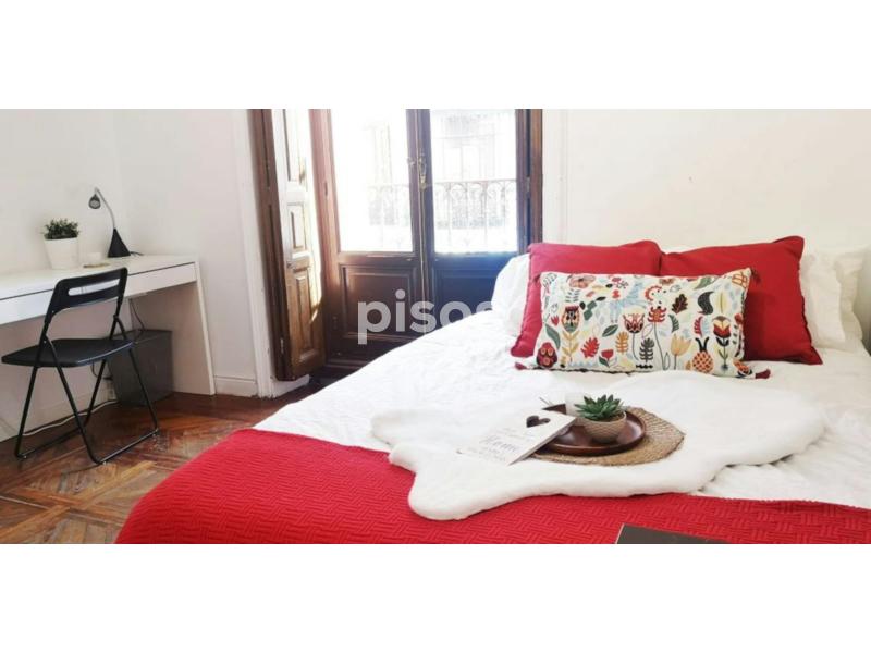 Beautiful and spacious room with a large outdoor balcony that overlooks Preciados Street. It has everything you need, as a double bed (135 cm), a single wardrobe, a bedside table and a desk with a lamp. This bright room is the perfect one for young students and workers. The room measures 11.90 m2, it has a lock and has electric heating.. *Bedding is not included, only a matress cover is provided.*