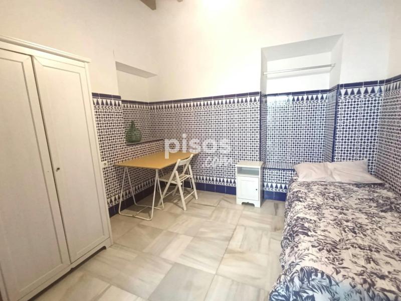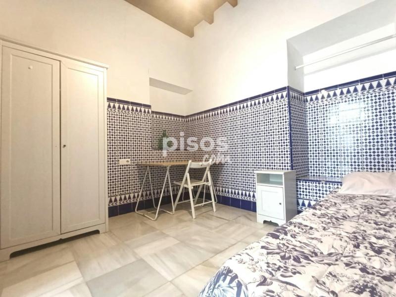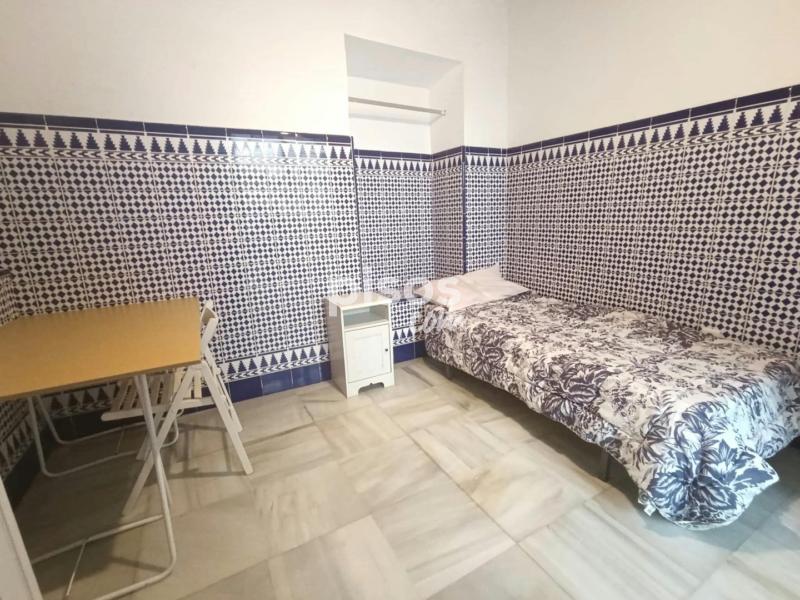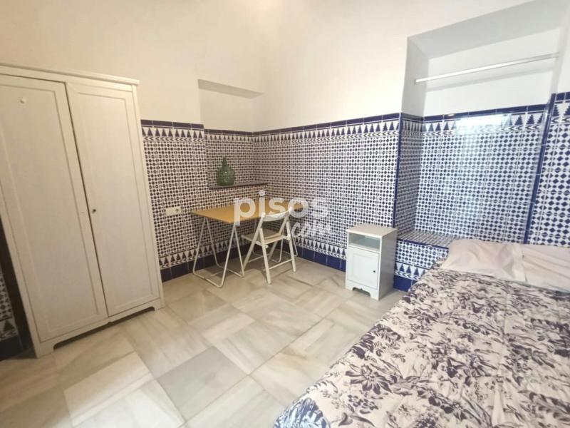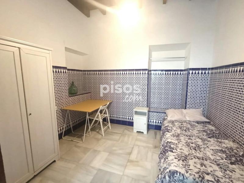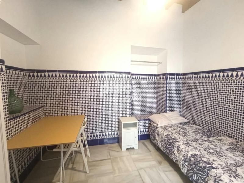Antigua casa sevillana con mucho encanto y luz. Se compone de tres plantas con amplios pasillos. En la planta baja hay seis habitaciones; una cocina con frigorífico, microondas, lavadora...; una sala de estar en un patio interior techado; y dos cuartos de baño (con ducha). En la primera planta hay tres habitaciones; y en la segunda planta, un dormitorio, un baño y la azotea, para el uso de tender ropa.