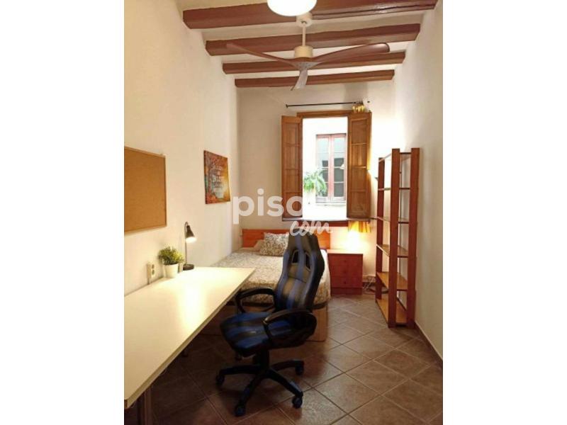 Habitación interior acogedora y luminosa para estudiantes internacionales y jóvenes trabajadores, en la calle Escudellers, frente a la plaza George Orwell. La habitación cuenta con una cama semi doble (120 cm x 190 cm), escritorio, silla, armario, calefacción central, ventilador de techo, televisión, nevera pequeña y cerradura propia para mayor privacidad.