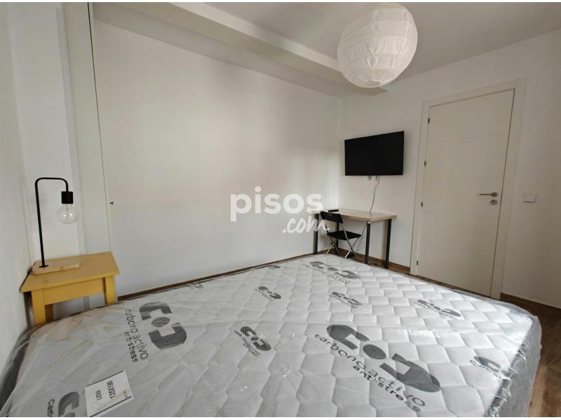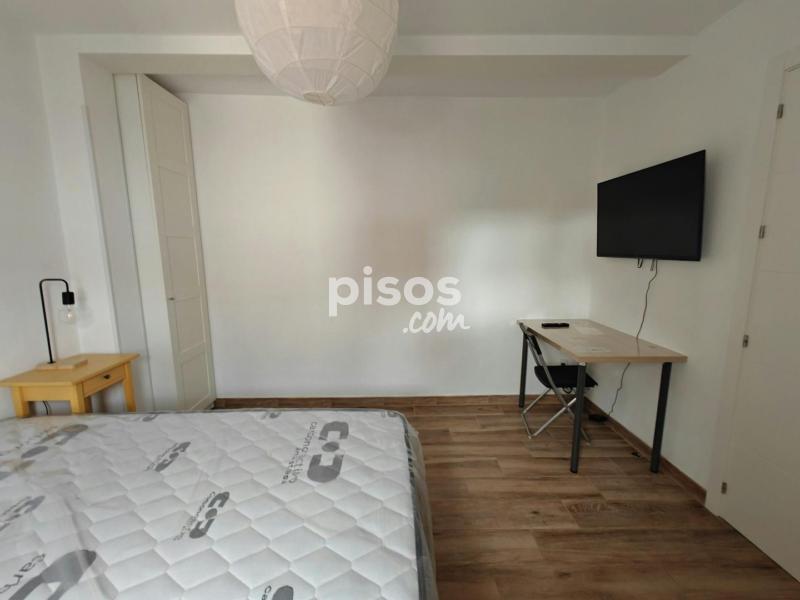 Habitación 1: Amplia habitación individual, exterior, con cama doble de 135cm, canapé, televisión, armario dos amplios armarios de suelo a techo, escritorio, silla, dos mesillas de noche, radiador y mucha luz natural.