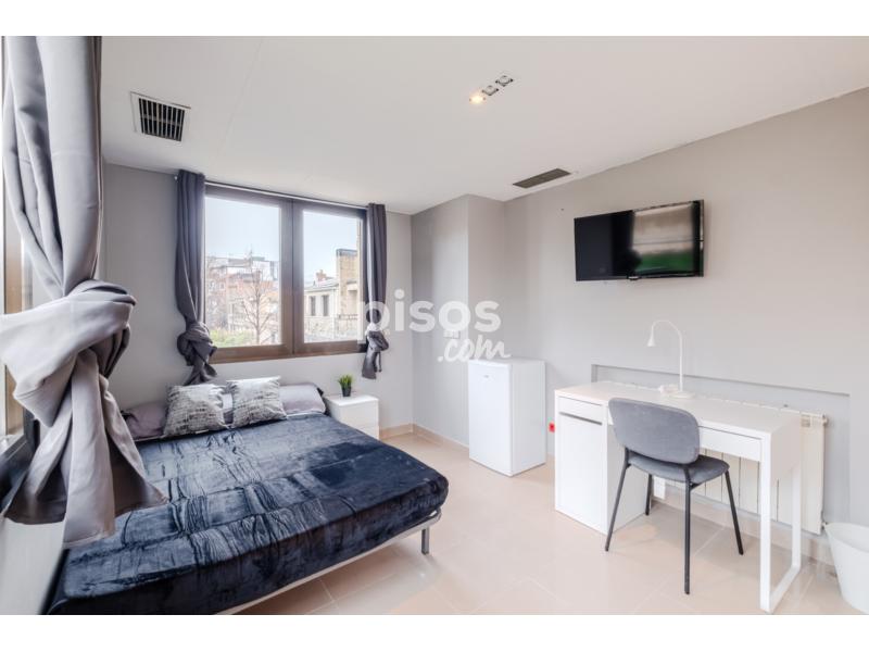 Habitación: Cama doble con mesita de noche, aire acondicionado, armario, espejo, escritorio con silla y lampara, smart tv, mininevera, perchero con estantes para colgar y almacenar toallas, abrigos u otros, cesta de ropa sucia, cesta de basura, ventanal con mucha iluminación.