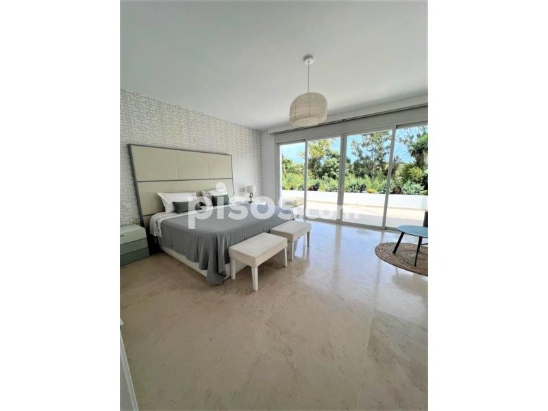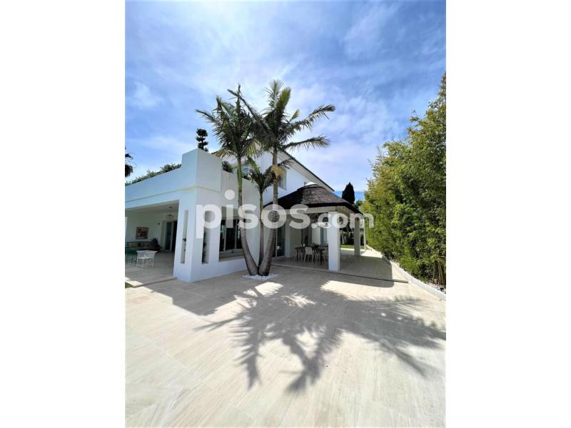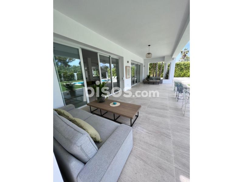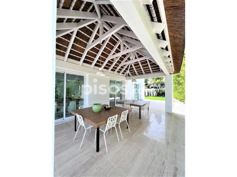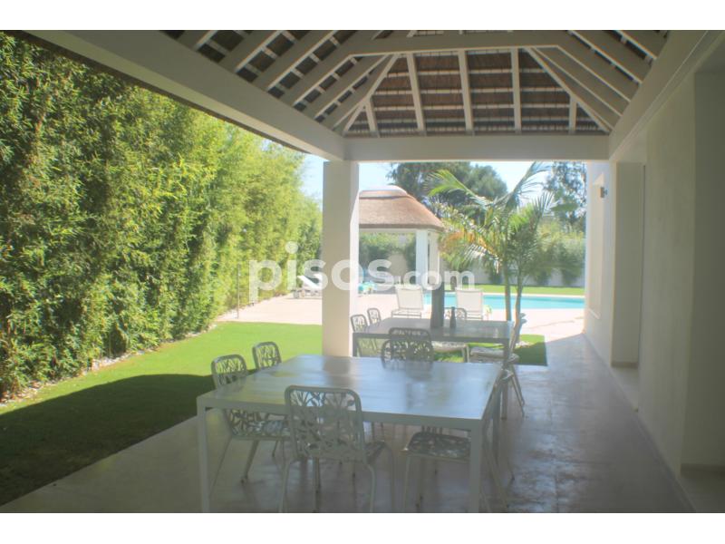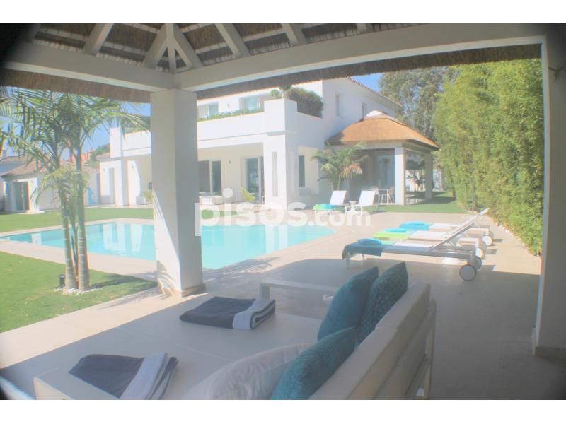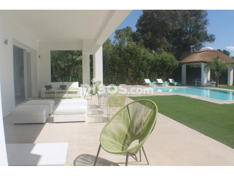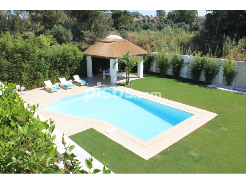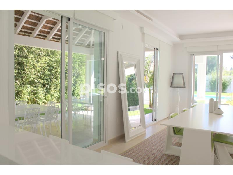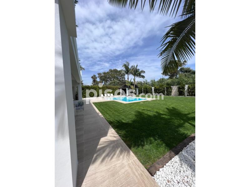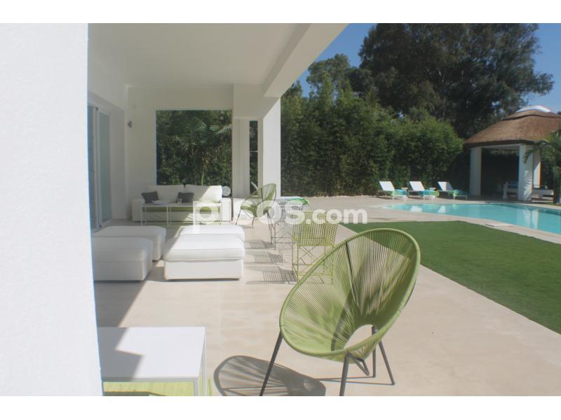 Propiedad de 5 habitaciones amplias una de ellas separada de la casa principal, amplísimo salon con cocina Americana y con 2 porches, uno de comedor y otro salón de verano. Maravilloso jardin con Pégola de piscina, Con Parking techado para 2 coches. Zona bien comunicada, con servicios cómo campos de golf, Club de Padel, etc. a 10 minutos andando a la playa. ''