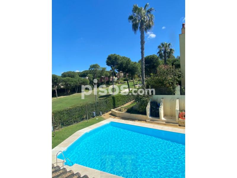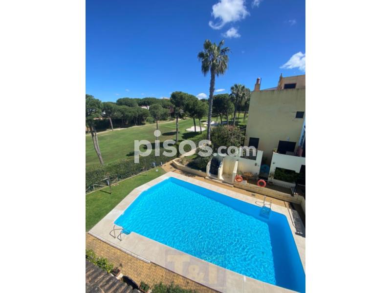 Fantástico adosado en primera línea del campo de golf de Islantilla, a solo 8 minutos de la playa Ubicada en la exclusiva urbanización Oropéndola, una de las mejores zonas dentro del campo de golf de Islantilla, esta acogedora vivienda ofrece el equilibrio perfecto entre tranquilidad y cercanía al mar. El adosado, distribuido en tres plantas, cuenta con todo lo necesario para una estancia confortable: Planta baja: acceso desde una terraza con vistas a la piscina, luminoso salón-comedor aseo con ducha y cocina totalmente equipada con salida a otra terraza ideal para desayunos al aire libre. Primera planta: dos dormitorios con ventiladores de techo y un baño completo con bañera. Segunda planta: dormitorio en suite con baño incorporado, balcón privado con vistas al campo de golf y televisor. Además, la vivienda dispone de plaza de garaje en sótano, lo que aporta comodidad.