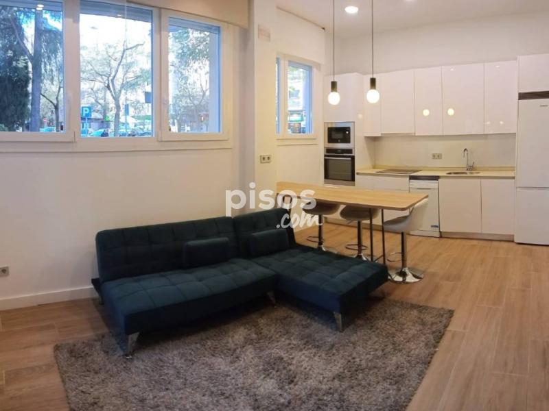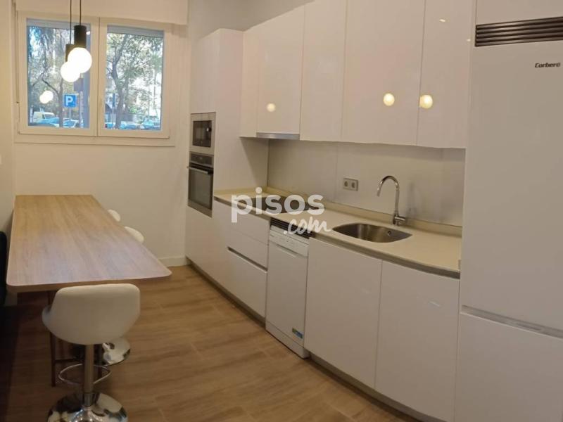 Se accede a la vivienda a pie de calle por la primera planta donde encontramos el salón con cocina abierta con una gran mesa de comedor/despacho con taburetes y aseo de cortesÃa. Esta estancia cuenta con cuatro grandes ventanales sobreelevados para conferir privacidad y con mucha luz, gracias a su orientación sur y este. La cocina está provista de todos los electrodomésticos: lavavajillas estrecho, nevera combi, vitrocerámica con campana, horno y microondas en columna y lavadora en el aseo separada por puerta corredera. Hay posibilidad de incluir secadora a petición del inquilino.