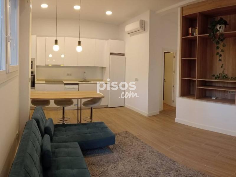 Se accede a la vivienda a pie de calle por la primera planta donde encontramos el salón con cocina abierta con una gran mesa de comedor/despacho con taburetes y aseo de cortesÃa. Esta estancia cuenta con cuatro grandes ventanales sobreelevados para conferir privacidad y con mucha luz, gracias a su orientación sur y este. La cocina está provista de todos los electrodomésticos: lavavajillas estrecho, nevera combi, vitrocerámica con campana, horno y microondas en columna y lavadora en el aseo separada por puerta corredera. Hay posibilidad de incluir secadora a petición del inquilino.