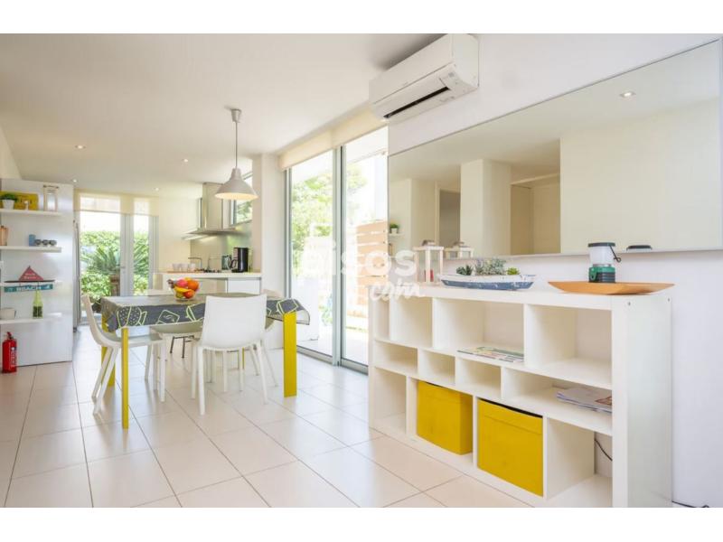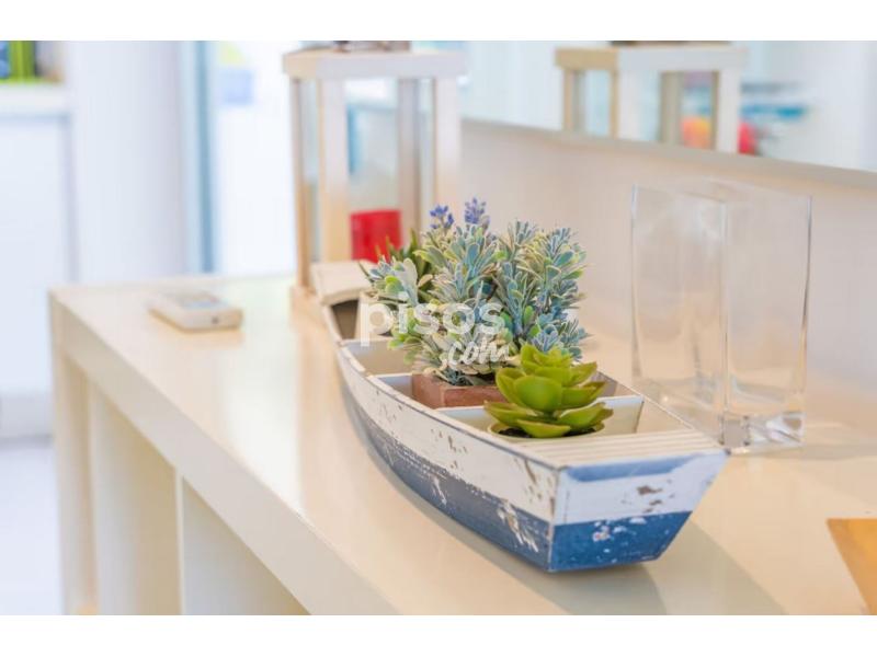 Se encuentra en una planta baja muy bien distribuida, luminosa y aireada. El salón está en el mismo espacio que el comedor y la cocina, con un estilo muy moderno y actual. Hay un gran sofá con capacidad para cuatro personas y, el comedor está equipado con una moderna mesa con cuatro sillas. La cocina tiene todo lo necesario para que podáis cocinar sin problemas incluyendo una cocina de gas nevera con congelador, horno, y lavavajillas. Además en la casa encontrarás lavadora, plancha y tabla de planchar. Para descansar este apartamento ofrece dos habitaciones con cama doble, una de ellas con una cama nido individual adicional. Las dos habitaciones tienen ventanas, además la de matrimonio cuenta con vistas al mar. La casa tiene un baño muy grande con ducha.