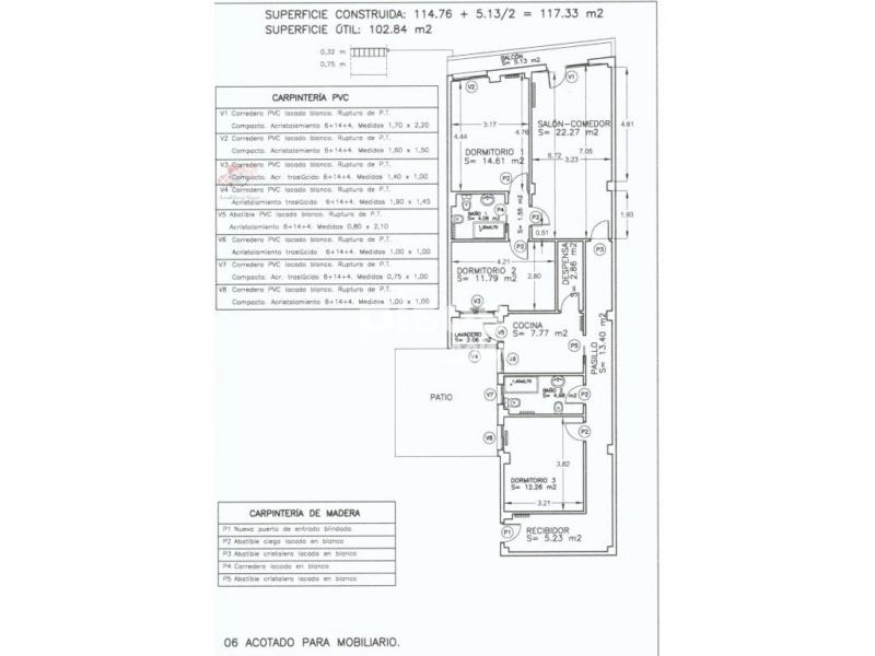 Piso en primera planta de 114 metros construidos, y casi 103 útiles. Descripción del piso: Salón comedor, cocina con lavadero y despensa, tres dormitorios y dos baños. Balcón corrido (salón y dormitorio) de 5.13 mts. Dispone de calefacción central.
