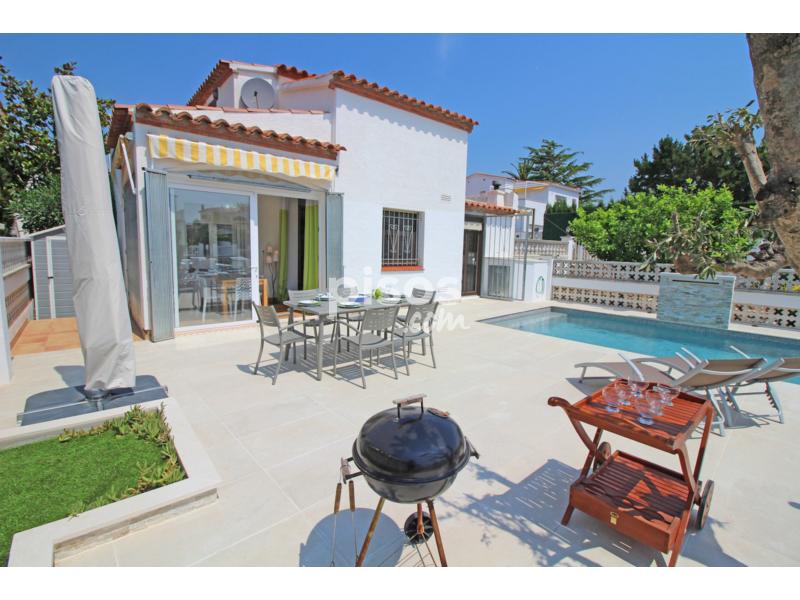 La villa en Empuriabrava posee 2 dormitorio(s) y capacidad para 6 personas. Alojamiento de 66 m² acogedor y exterior. Una casa muy bonita con 2 dormitorios y un coarto de bano. Tiene excelente urbicacion a 500 m del supermercado, 2 km de la playa de arena "Empuriabrava", 16 km del campo de Golf "Peralada", 20 km de la estación de tren "Ave/Tgv Figueres", 65 km del aeropuerto "Girona" y está ubicado en una zona ideal para familias y dentro de una urbanización. Se encuentra a 500 m del supermercado, 2 km de la playa de arena "Empuriabrava", 16 km del campo de Golf "Peralada", 20 km de la estación de tren "Ave/Tgv Figueres", 65 km del aeropuerto "Girona" y está ubicado en una zona ideal para familias y dentro de una urbanización. Dispone de mobiliario jardín, parcela vallada, terraza, barbacoa, chimenea, plancha, acceso internet (wifi), calefacción bomba de calor, aire acondicionado solo en salón, piscina privada, Televisión, tv satelite (Idiomas: Español, Alemán, Francés), Dvd. La cocina americana, de vitrocerámica, está equipada con nevera, microondas, horno, congelador, lavadora, lavavajillas, vajilla/cubertería, utensilios/cocina, cafetera, tostadora y hervidor de agua.