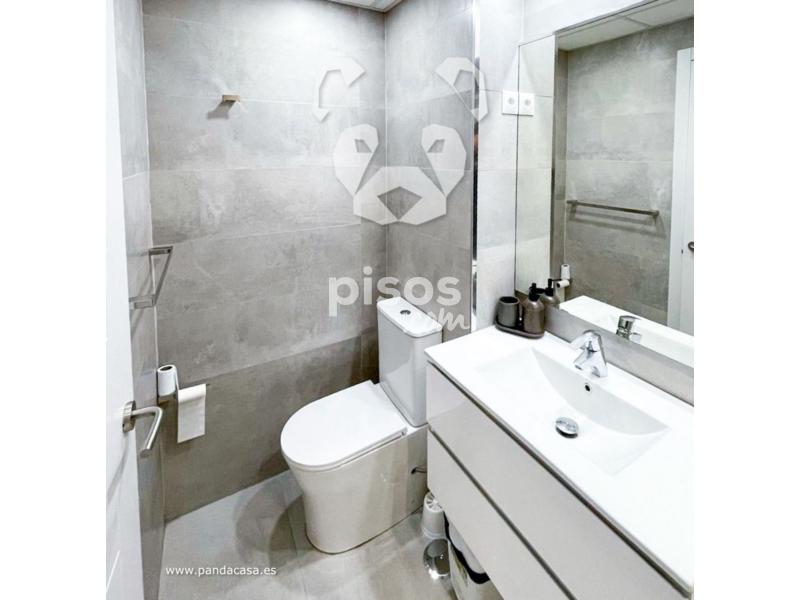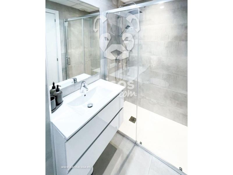 El dormitorio doble cuenta con baño en suite diseñado para máximo confort. La vivienda dispone también de un segundo baño completo con amplio plato de ducha y mampara de cristal, accesible desde la zona de día. Aire acondicionado frío/calor en todas las estancias, suelo laminado gris, paredes en blanco liso y estores día/noche que equilibran luz y privacidad. Mobiliario moderno y cuidado: sofá, mueble TV, mesa de comedor con sillas, aparador y equipamiento completo.