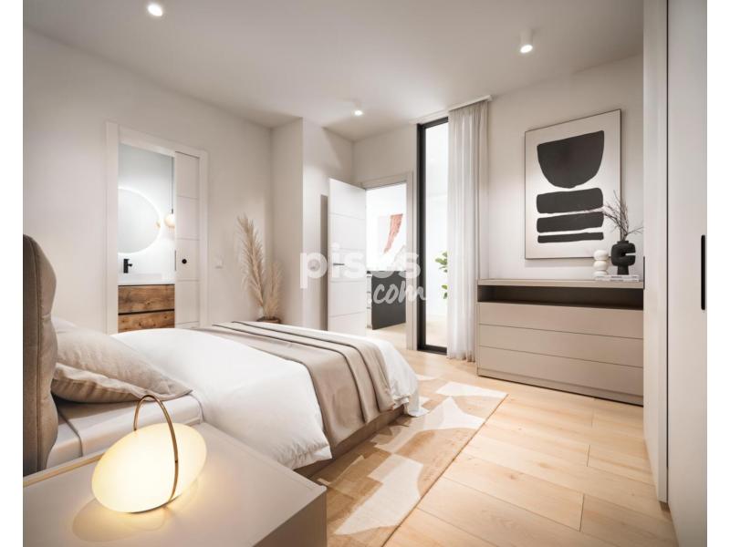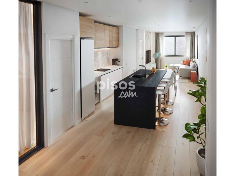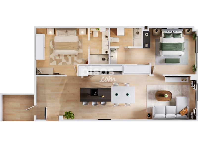 Se distribuye en dos dormitorios, amplio salón con cocina abierta e isla central, completamente equipada, y dos baños completos.